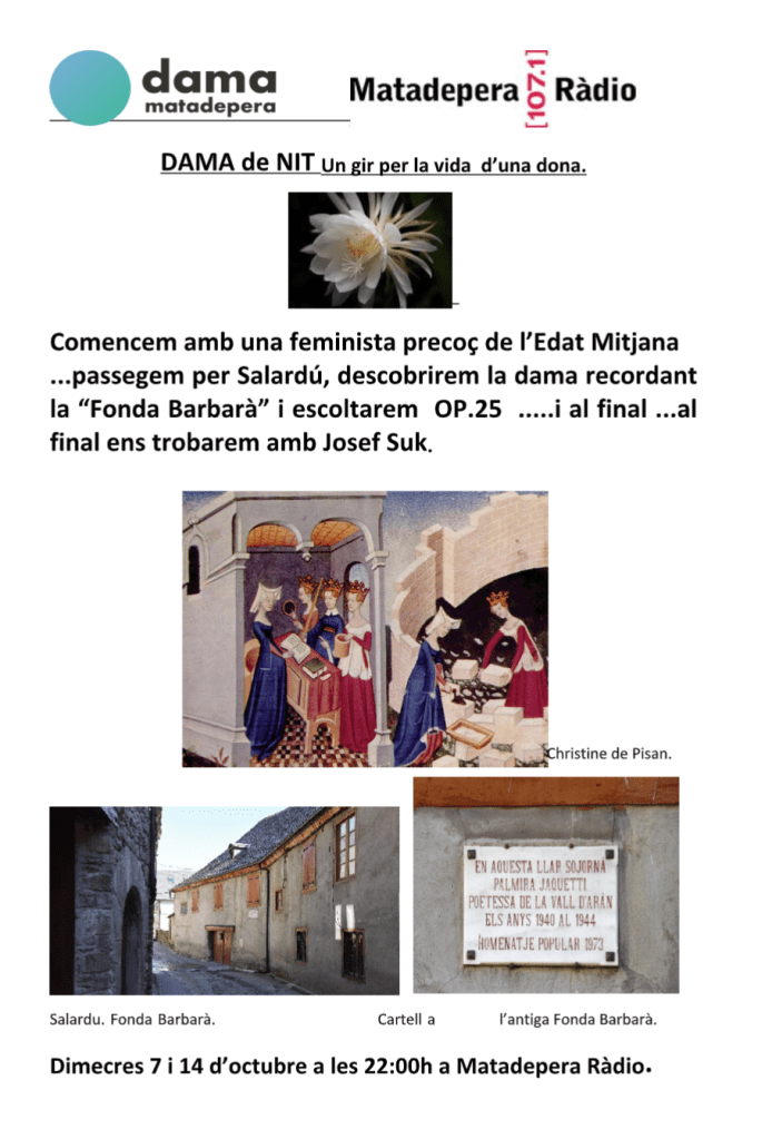 Vam dedicar el programa a Palmira Jaquetti poetessa, compositora, pedagoga, pianista, folklorista i conferenciant. L’obra poètica de Palmira està reunida en deu reculls dels quals un sol publicat “ L’estel dins la llar.” Tot el fons de Palmira Jaquetti és conservat a la Biblioteca Catalunya. Tota la música que vam posar era era OPUS 25 pel fet de que és el programa n. 25. Al programa vam comptar amb Montse Pineda poeta.