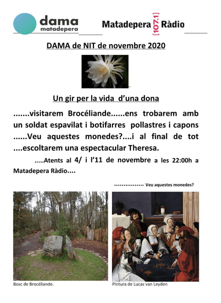 El programa el vam dedicar a la primera dona catalana que va fer espectacles de màgia , Teresa Gutsens que la vam tenir per antena ja que el 12 de novembre d’enguany era el seu 95 aniversari. Vam començar “Dama de Nit” amb la rondalla “El soldat i el llibre meravellós” de Pau Bertran i Bros.